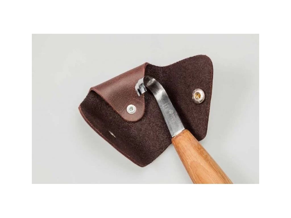 řezbářský nástroj s delší ergonomickou rukojetí z jasanu a jednostranným ostřím z uhlíkové oceli 85mm určený pro vyřezávání lžiček, misek a hluboké hladké řezy dodávaný s koženým pouzdrem