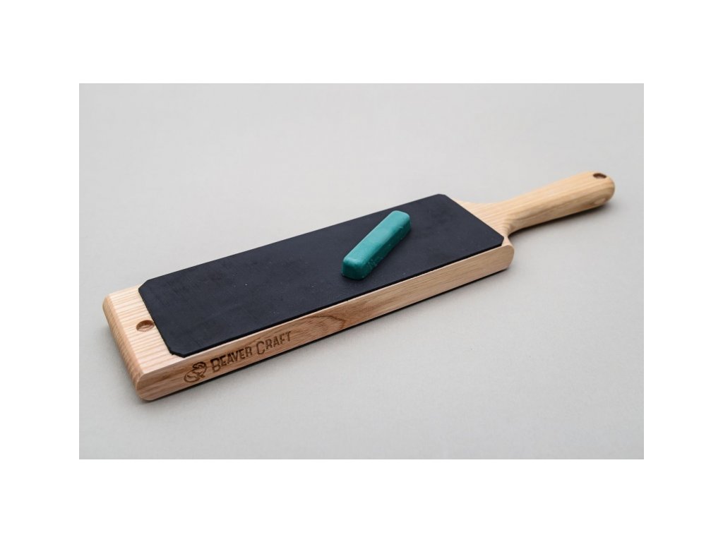Pruh kůže o délce 23 cm je pevně upevněný na dřevěné desce na obou stranách, kůže se může používat buď samostatně, nebo s brusnou pastou.