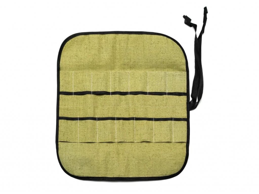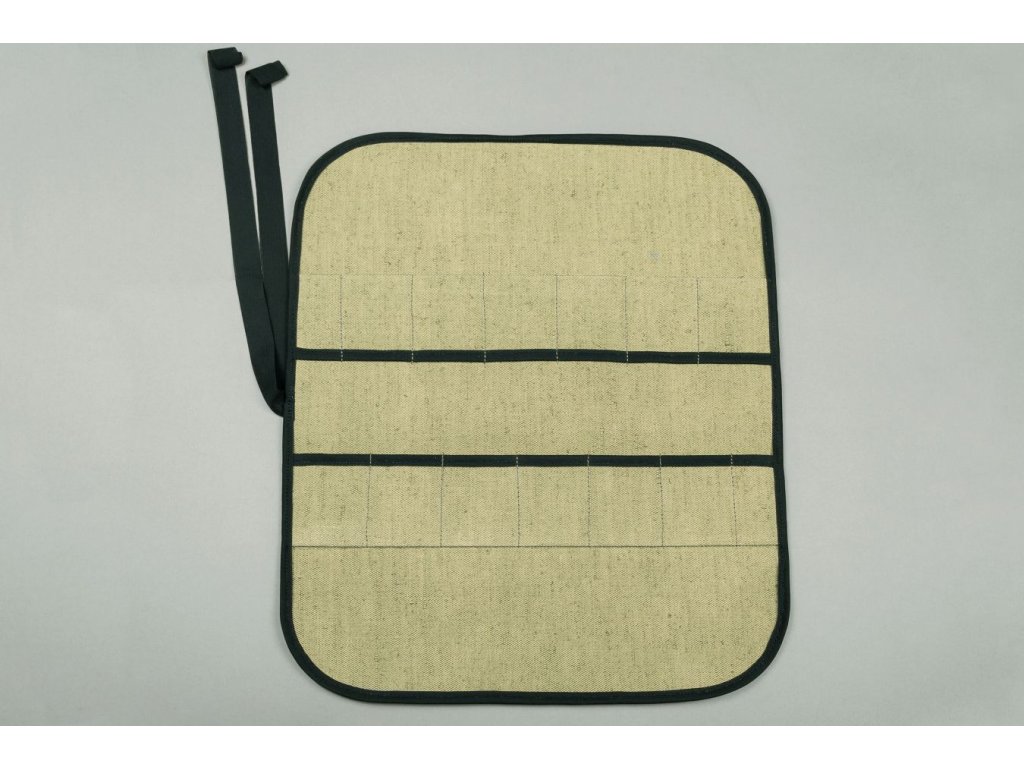 Pouzdro pro uložení řezbářských nožů, dlát a dalších nástrojů vyrobené z kvalitního silného plátna prošitého lněnou nití.