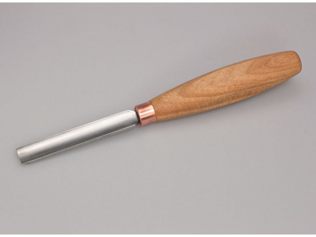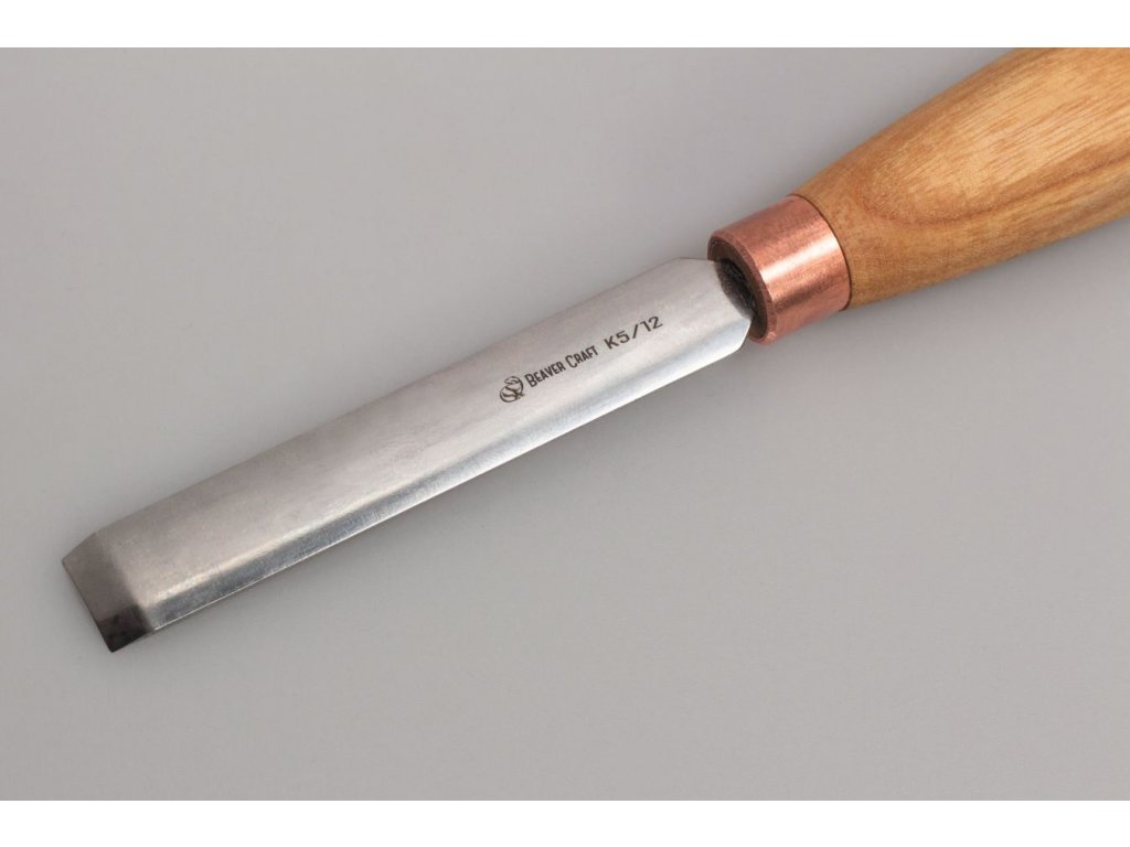 kompaktní rovné zaoblené řezbářské dláto s rukojetí z jasanu a kratší čepelí z uhlíkové oceli o šířce 12mm s rovnou hranou s jednoduchým zkosením pro primární tvarování povrchu