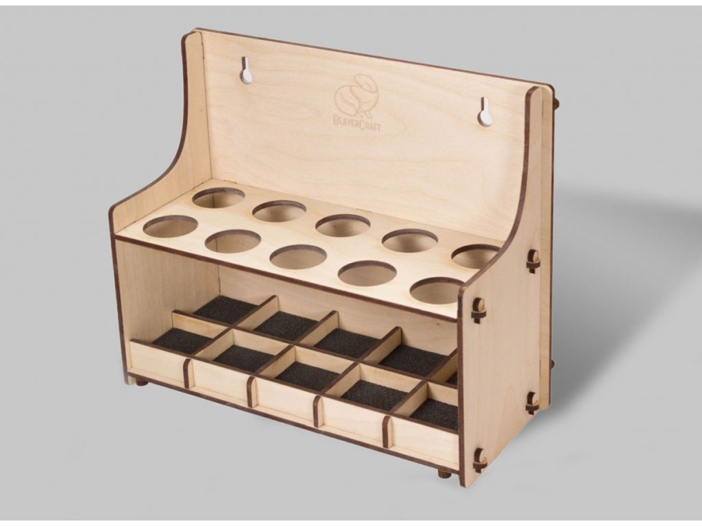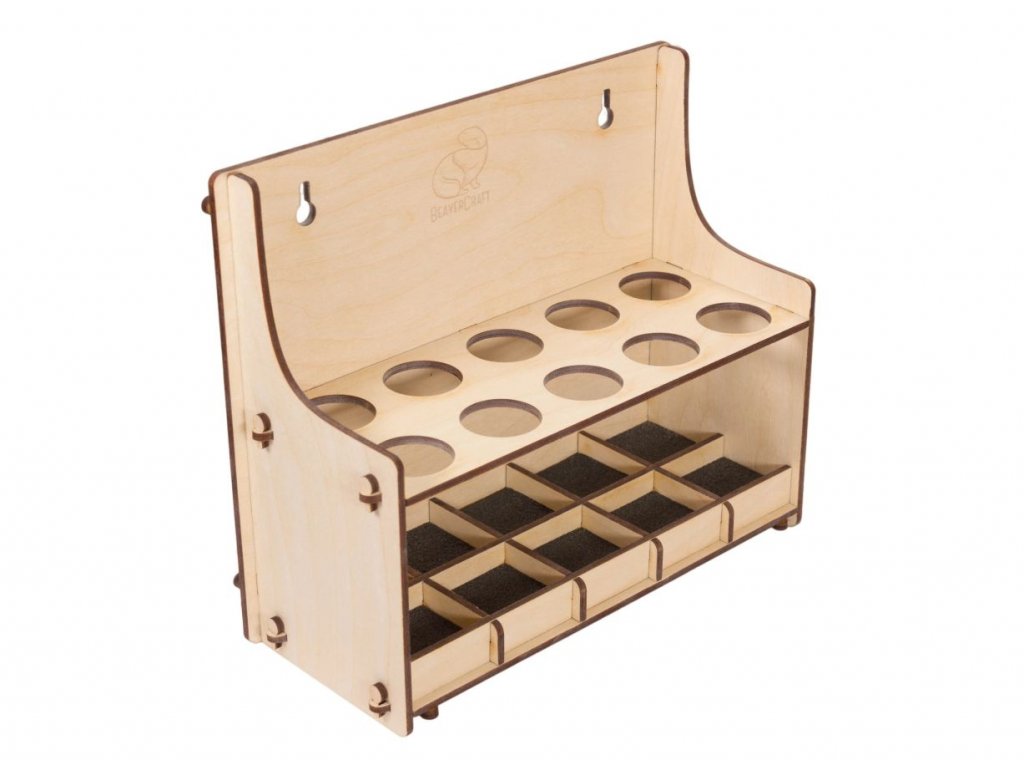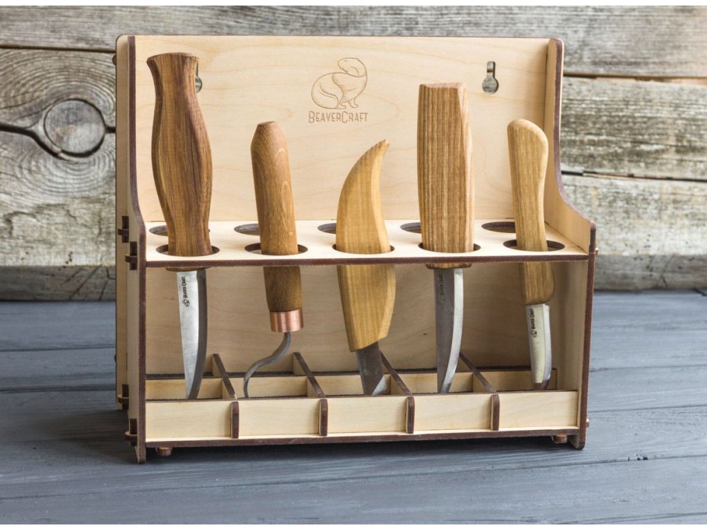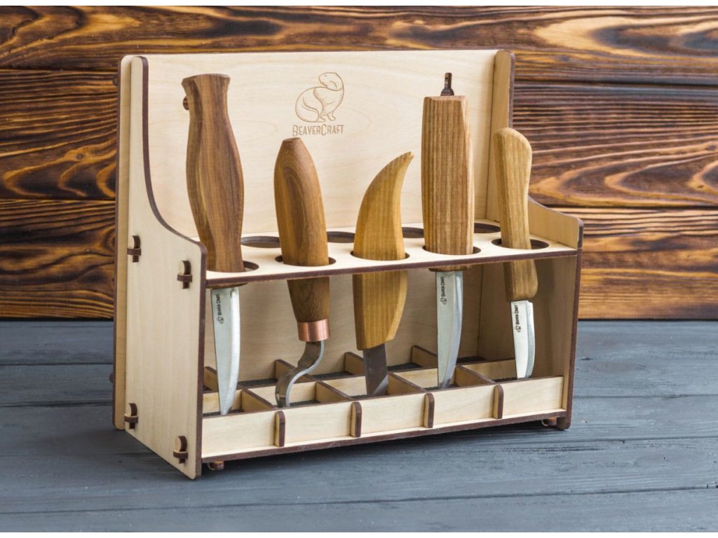 Stojan vyrobený ze světlé překližky navržený pro přehledné uskladnění deseti řezbářských nástrojů značky BeaverCraft, který se bude skvěle vyjímat ve vaší dílně nebo kdekoliv, kam se ho rozhodnete umístit.