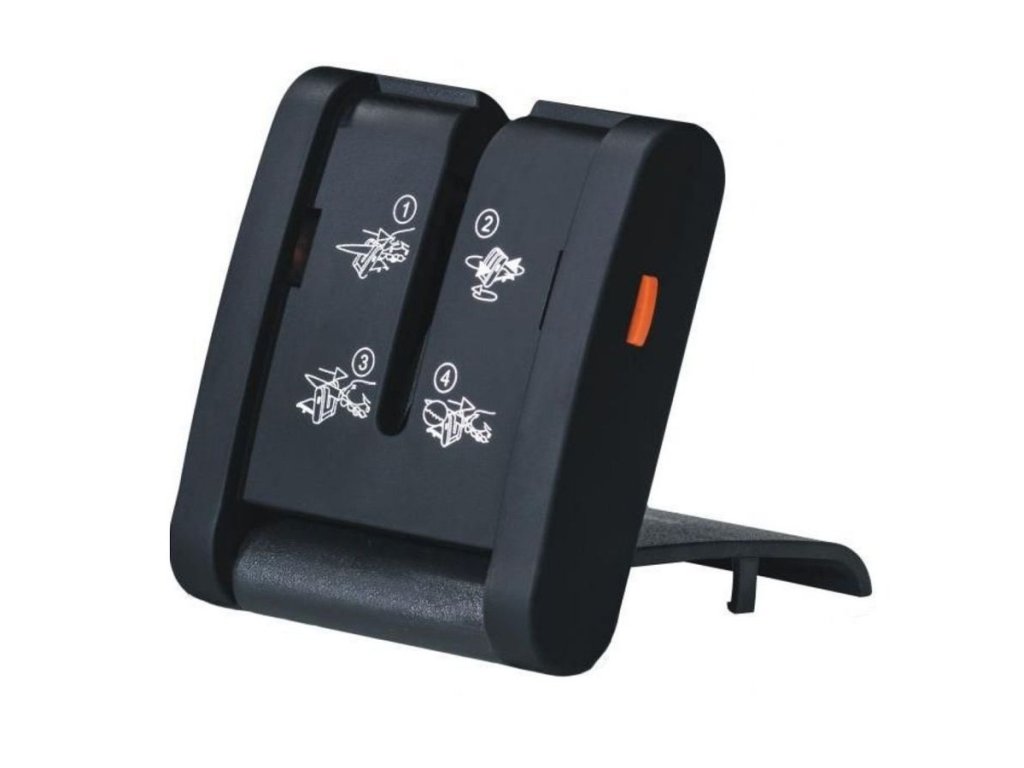 prvotřídní výklopný brousek na nože s rovným i ozubeným ostřím pracující na principu patentovaného pružinového systému s brusnými tyčemi z karbidu a velmi jednoduchým ovládáním